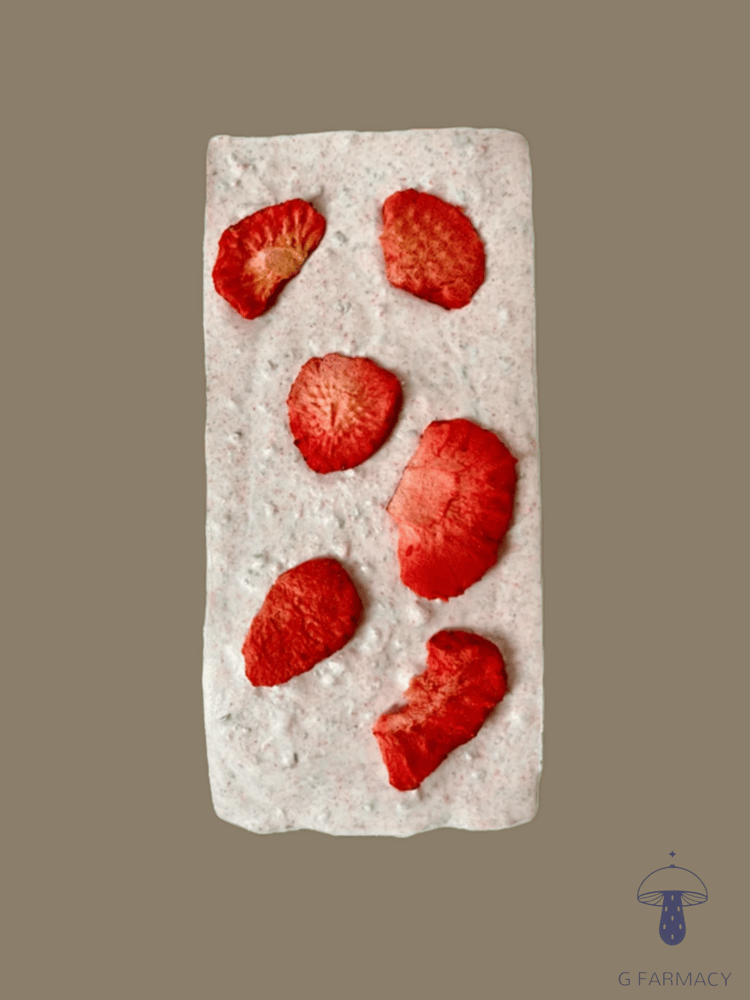 Smooth chocolate crafted for reflection, creativity, and quiet journeys of the mind. Infused with freeze dried strawberries & 2,000mg of dried psilocybin mushrooms.